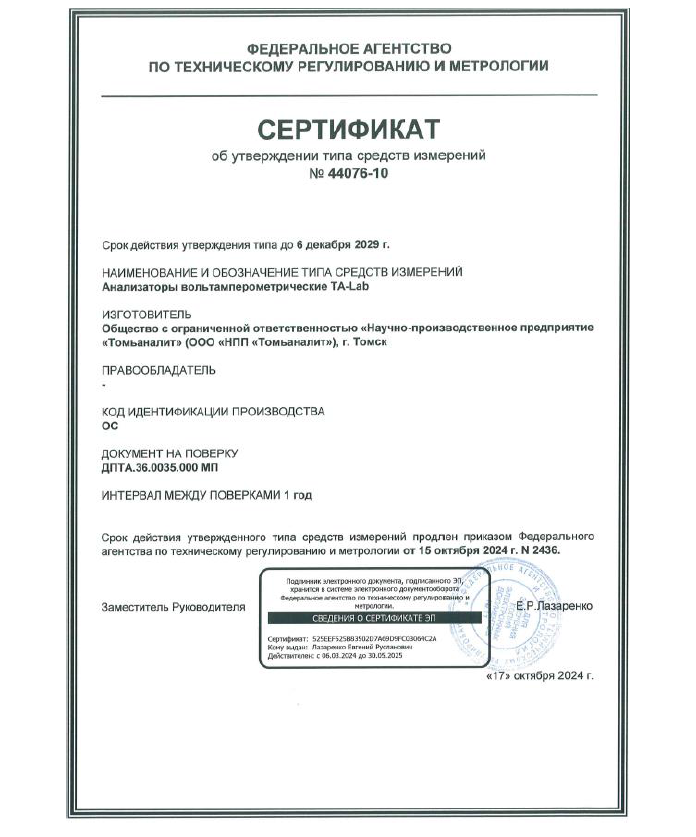 Анализатор вольтамперометрический ТА-Lab является средством измерений утвержденного типа (свидетельство об утверждении типа RU.C.31.113.A №39547).