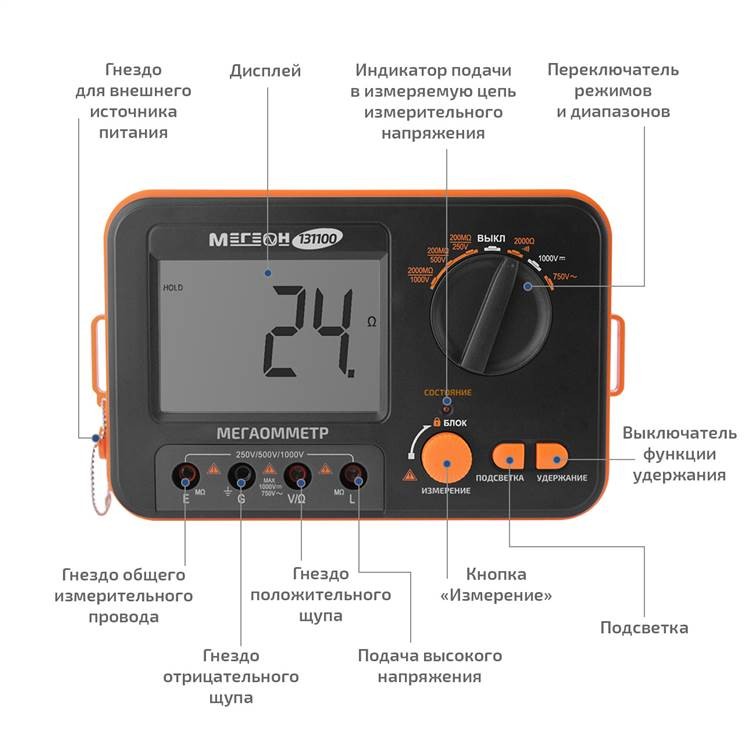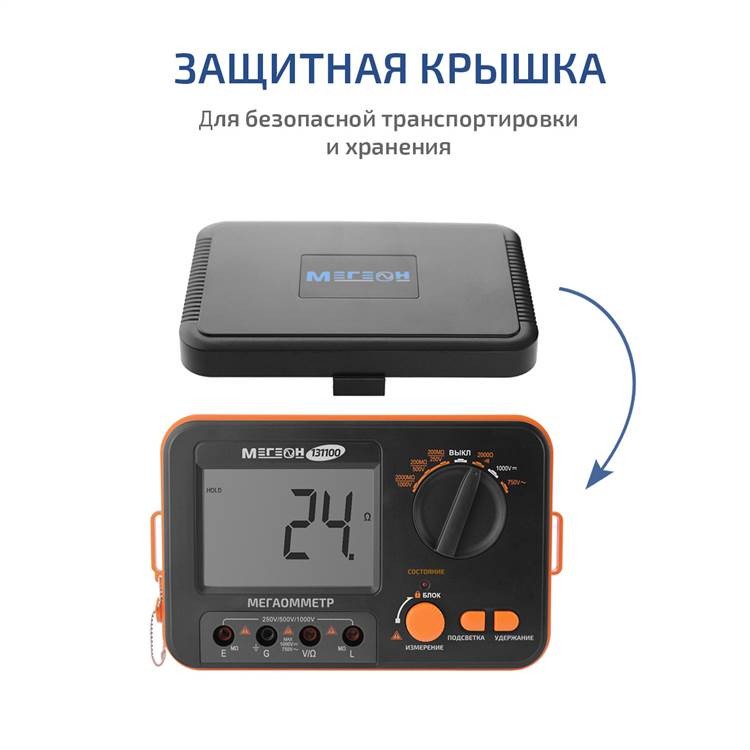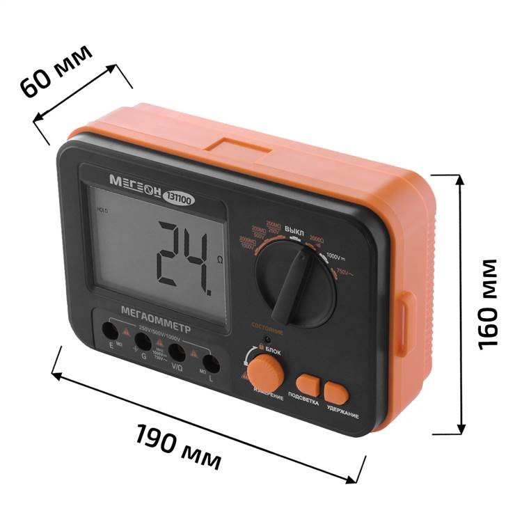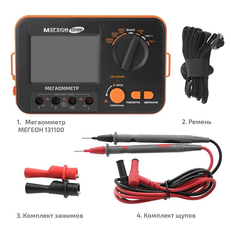 Мегаомметр МЕГЕОН 131100 оснащен тремя испытательными напряжениями: 250 В, 500 В и 1000 В. Базовая погрешность прибора составляет всего 4% ±2 единицы младшего разряда, что гарантирует высокую точность измерений. Прибор выводит данные в цифровом виде, что упрощает процесс считывания и анализа результатов.