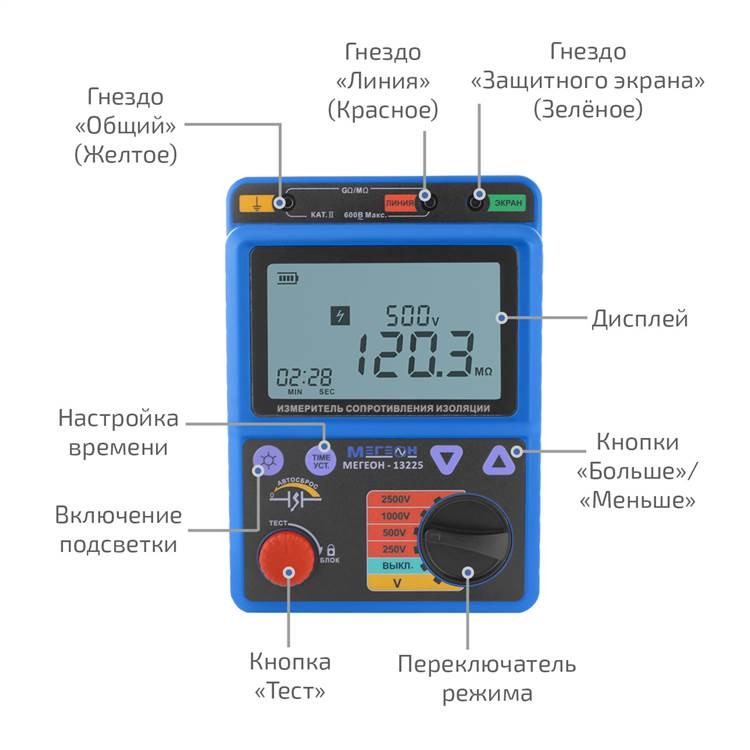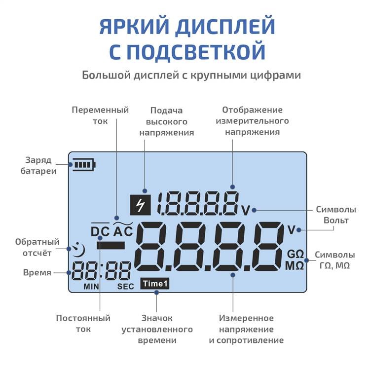 Мегаометр МЕГЕОН 13225 обладает большим дисплеем с крупными цифрами, что облегчает считывание результатов измерений. Подсветка дисплея позволяет проводить измерения даже в условиях плохой освещенности, что особенно актуально при работе в темное время суток или в слабоосвещенных помещениях.