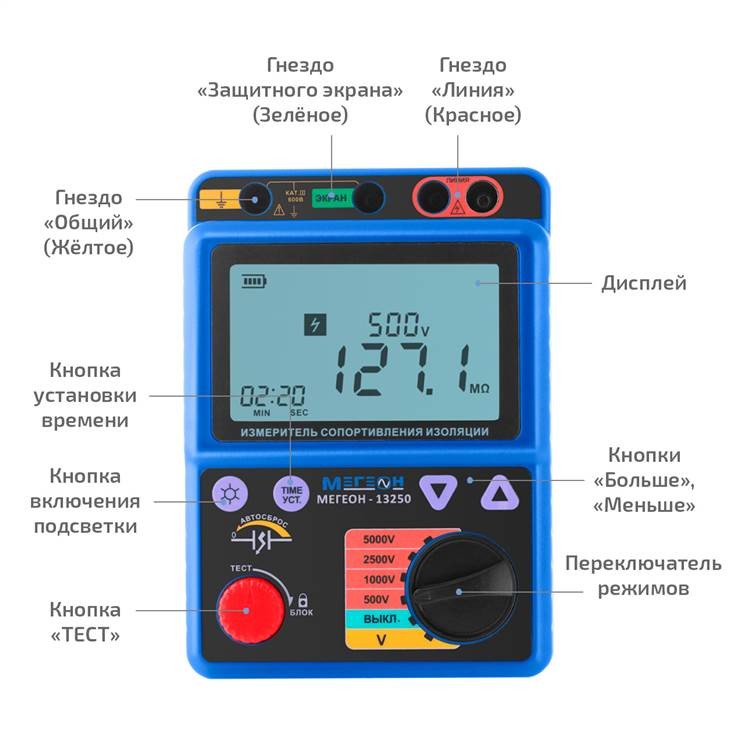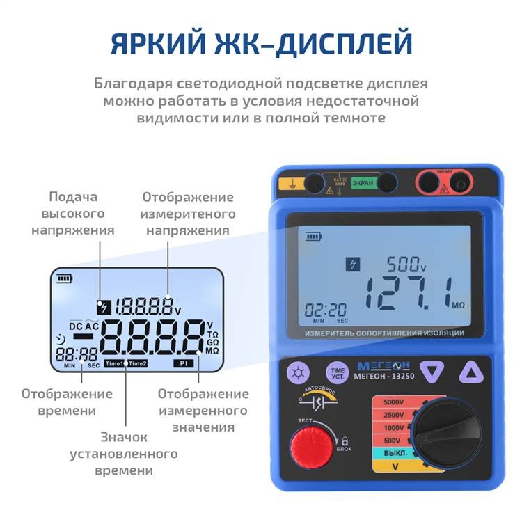 Функция непрерывного измерения сопротивления позволяет получать актуальную информацию о состоянии изоляции в реальном времени, что может быть полезно при проведении испытаний и проверок. Большой дисплей с подсветкой обеспечивает удобство считывания показаний даже в условиях слабой освещенности.