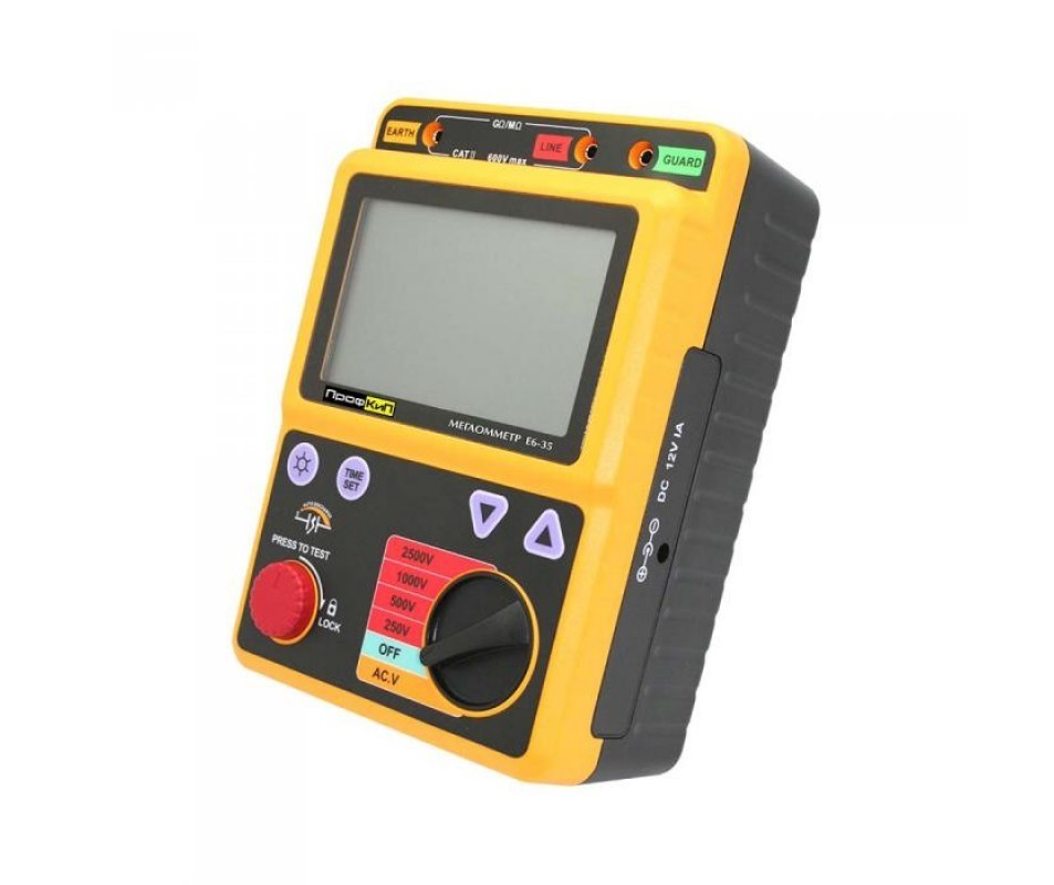 Мегаомметр цифровой ПрофКиП Е6-35 является базовым измерителем сопротивления изоляции. Измеритель сопротивления изоляции пригоден для использования для ремонта устройств и приборов на базе электромастерской. Электрический тестер имеет информативный жидкокристаллический экран большого размера. Измеритель изоляции ПрофКиП Е6-35 оснащен двухуровневой защитой от перегрузок. Тестер этой модели широко используется в энергетической отрасли. Модель ПрофКиП Е6-35 измеряет напряжение от 30 В до 600 В, т.е. одновременно может использоваться в качестве вольтметра.