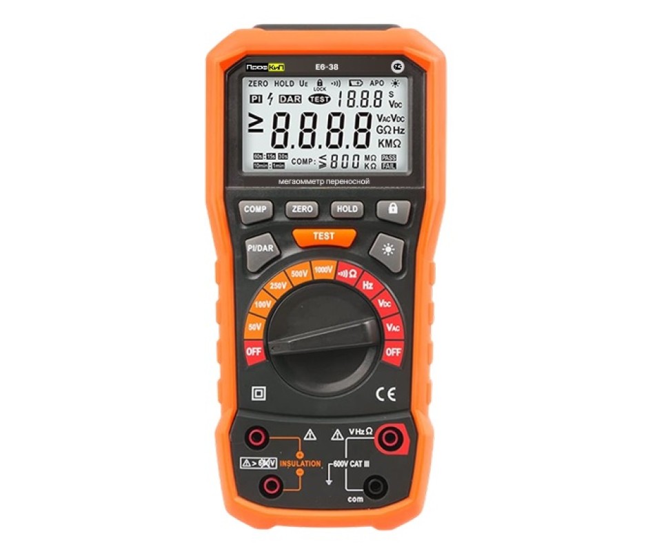 Мегаомметры цифровые переносные ПрофКиП Е6-38 предназначены для измерений сопротивления постоянного тока, частоты переменного тока, напряжения постоянного и переменного тока при проверке параметров изоляции. Средства измерений оснащены встроенным многофункциональным дисплеем и автономными источниками питания, что позволяет использовать их как мобильные средства измерений без привязки к сети питания.Мегаомметры представляют собой переносные цифровые измерительные приборы с автономным питанием. Прибор может быть использован при производстве, эксплуатации, ремонте и метрологической аттестации электроэнергетического и радиоэлектронного оборудования, а также при производстве кабельной продукции, изоляционных материалов, радиоэлектронных элементов.