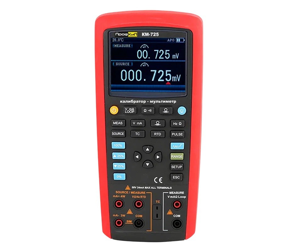напряжения постоянного тока; сопротивления постоянному току; частоты импульсного сигнала и количества импульсов; приборы осуществляют измерение температуры с помощью термопар типов: R; S; K; E; J; T; N; B; L; U; XK; BP; (с компенсацией температуры холодного спая).А так же с помощью термопреобразователей типов: Pt100; Pt200; Pt500; Pt1000; Cu10; Cu50; Cu100; Ni120; в режиме калибратора приборы обеспечивают формирование статических характеристик вышеуказанных термопреобразователей. Прибор оснащен ярким дисплеем с регулируемой подсветкой, прочным корпусом и эргономичной рукояткой.