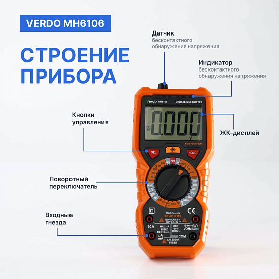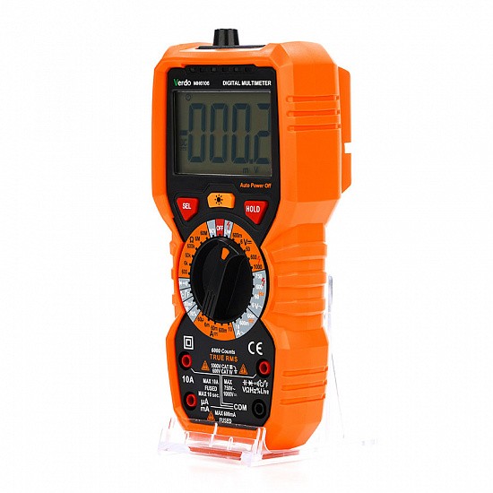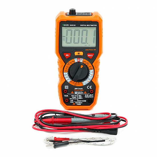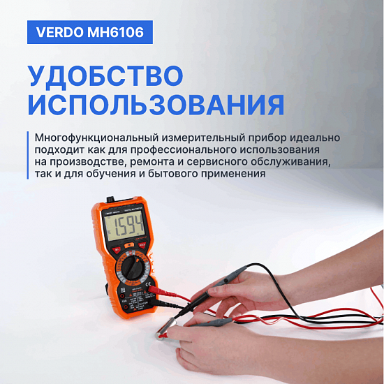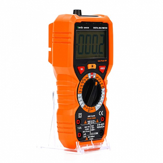 Мультиметр VERDO MH6106 – это ручной цифровой мультиметр с функцией отображения истинного среднеквадратичного значения (TrueRMS) и большим жидкокри-сталлическим дисплеем с подсветкой и фонарем, что облегчает считывание показаний. Мультиметр оснащен функцией защиты от перегрузки и индикатором разряженной батареи. Этот многофункциональный измерительный прибор идеально подходит как для профессионального использования на производстве, ремонта и сервисного обслуживания, так и для обучения и бытового применения.