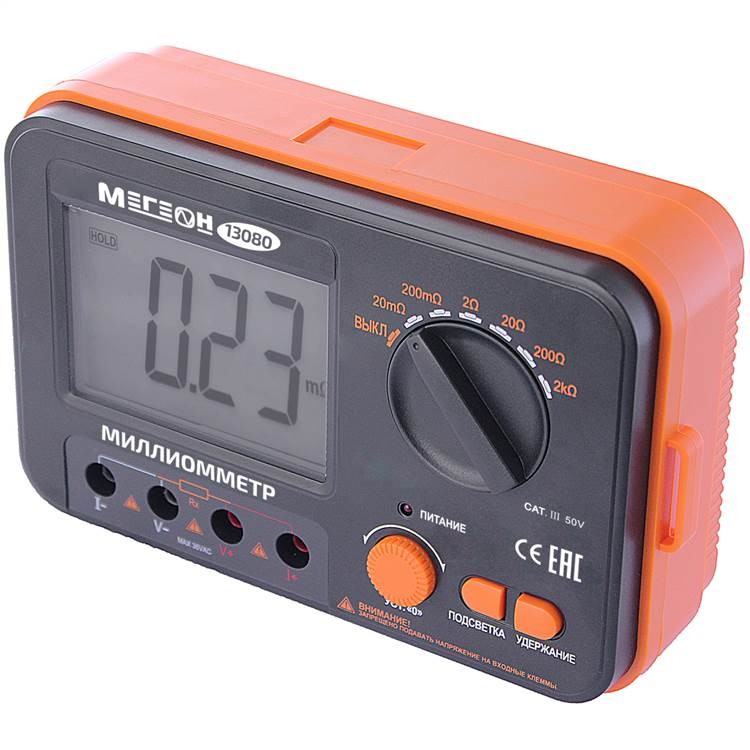 Компактный милиомметр МЕГЕОН 13080 от компании МЕГЕОН представляет собой высокоточный измерительный инструмент с богатым набором дополнительных функций. Этот прибор предназначен для измерения малых значений сопротивления от 0,01 милиом до 2 килоом.