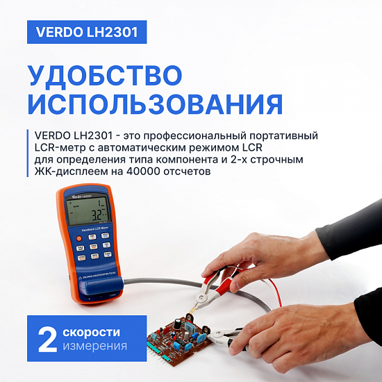 Профессиональный портативный LCR-метр VERDO LH2301 с тестовой частотой до 10 кГц и базовой погрешностью до 0,25%, обеспечивает инженеров мощным портативным инструментом для подбора пассивных компонентов на производстве и в ходе отладки и проектирования электронных систем. Функция автоматической идентификации типа компонента по его импедансу (функция измерения, диапазон, тестовая частота и эквивалентная схема выбираются автоматически), сортировка по допуску делают работу с измерителем сопротивления LCR простой и удобной.