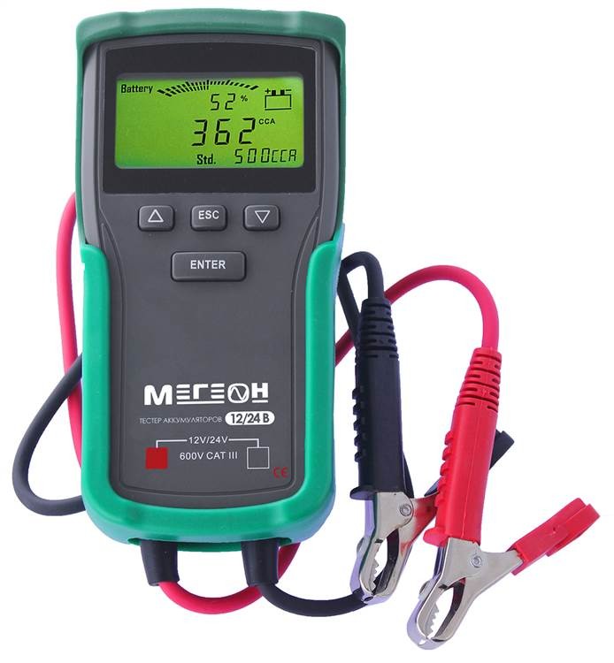 Тестер аккумуляторных батарей МЕГЕОН 81024 предназначен для проверки состояния кислотно-свинцовых аккумуляторов с напряжением 12 или 24 вольт. Устройство питается непосредственно от проверяемого аккумулятора, что обеспечивает его автономность и удобство использования.
