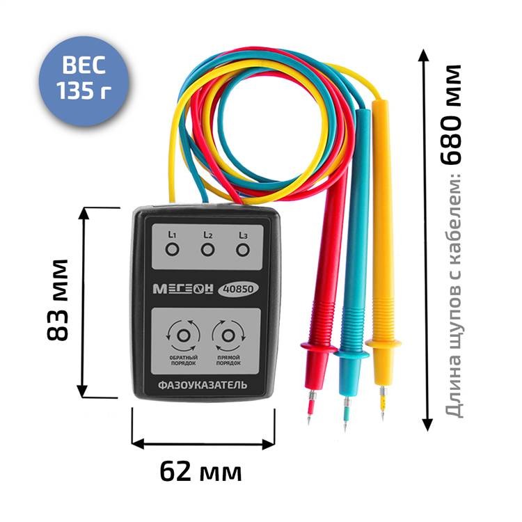 Фазоуказатель Мегеон 40850 - это универсальный инструмент для проверки напряжения и последовательности фаз в электрических сетях. С его помощью можно быстро и точно определить наличие напряжения, а также порядок следования фаз.
