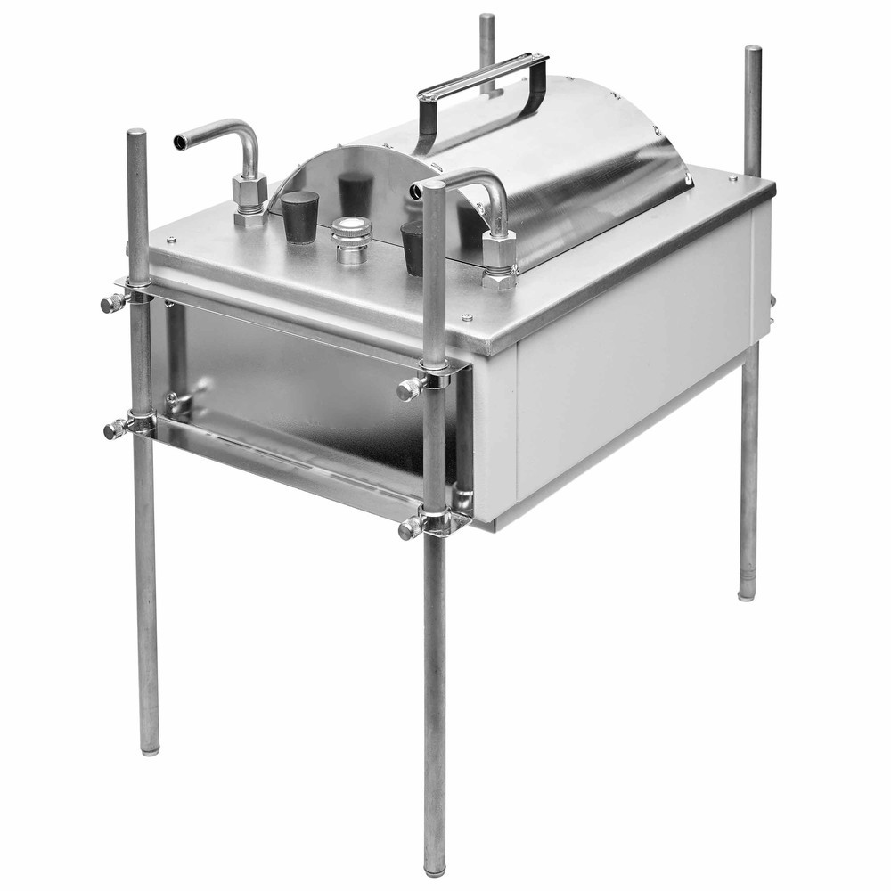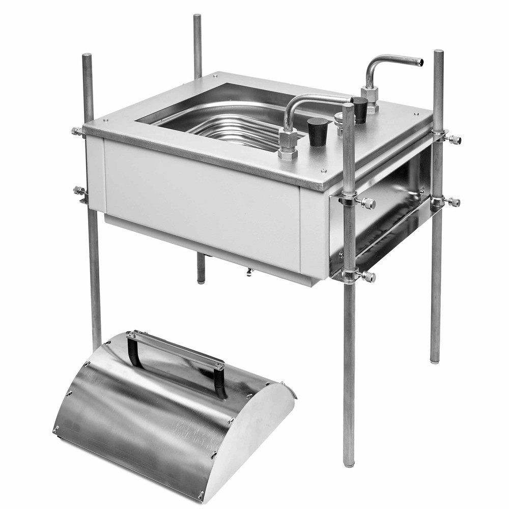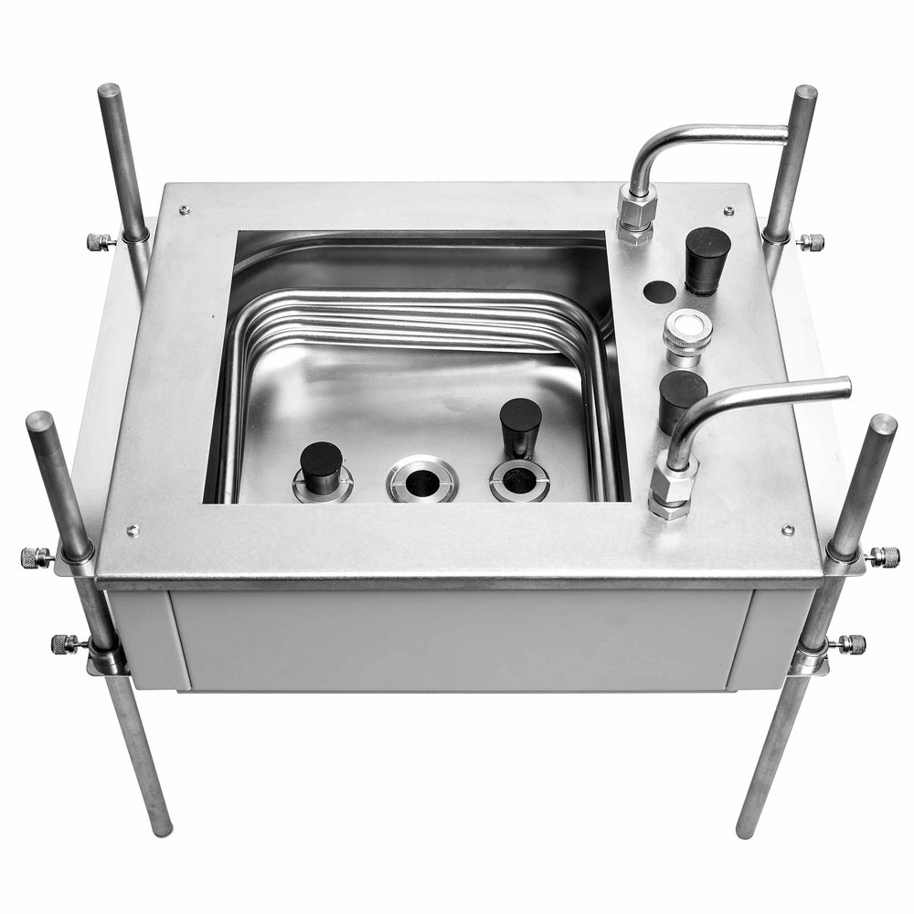 Охлаждение теплоносителя во внутренней ванне происходит посредством теплообмена с охлаждающей жидкостью, пропускаемой через расположенный внутри ванны теплообменник.
