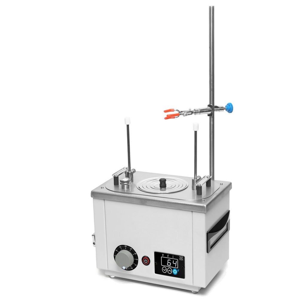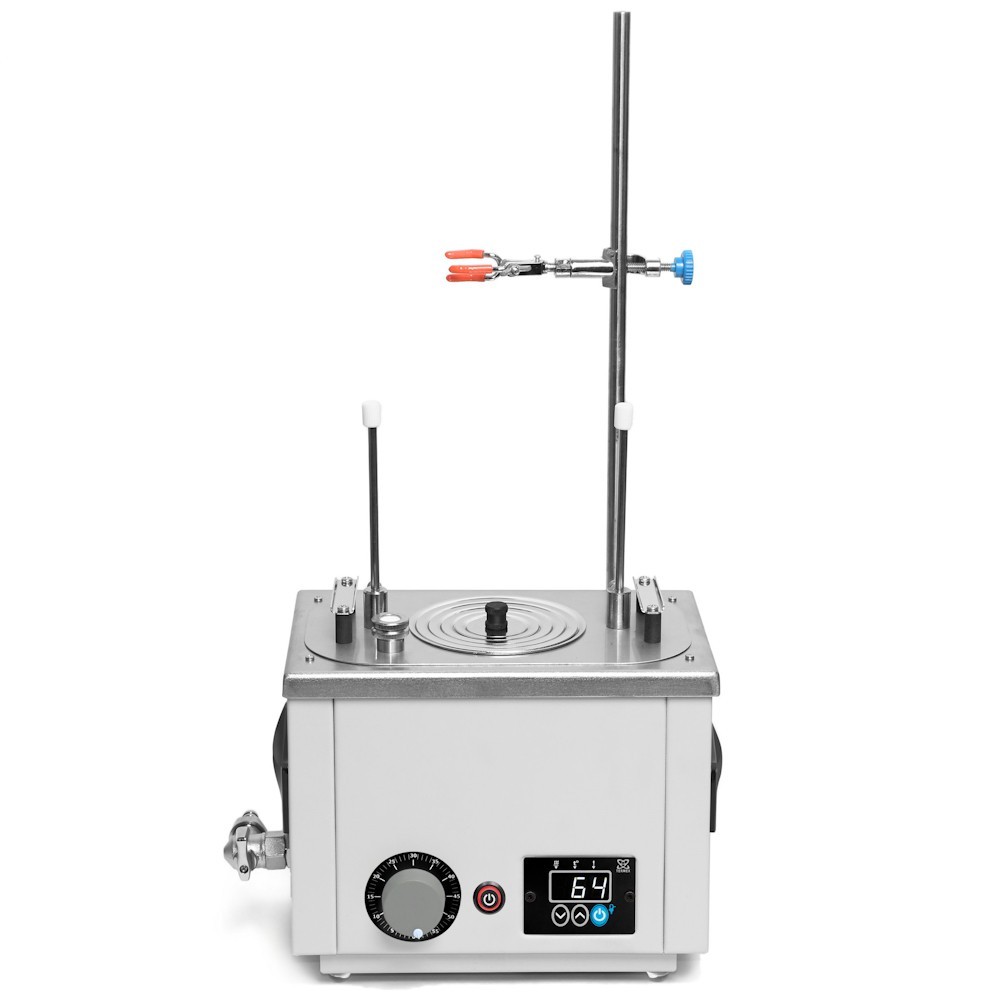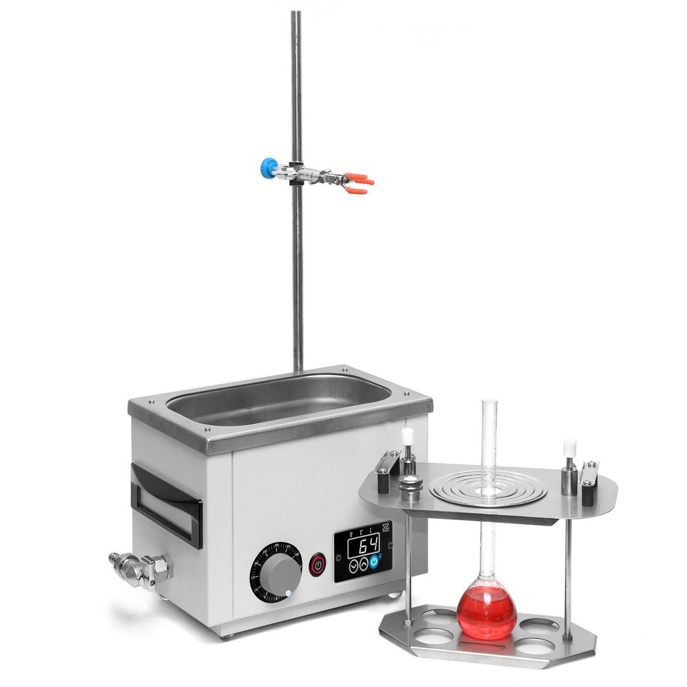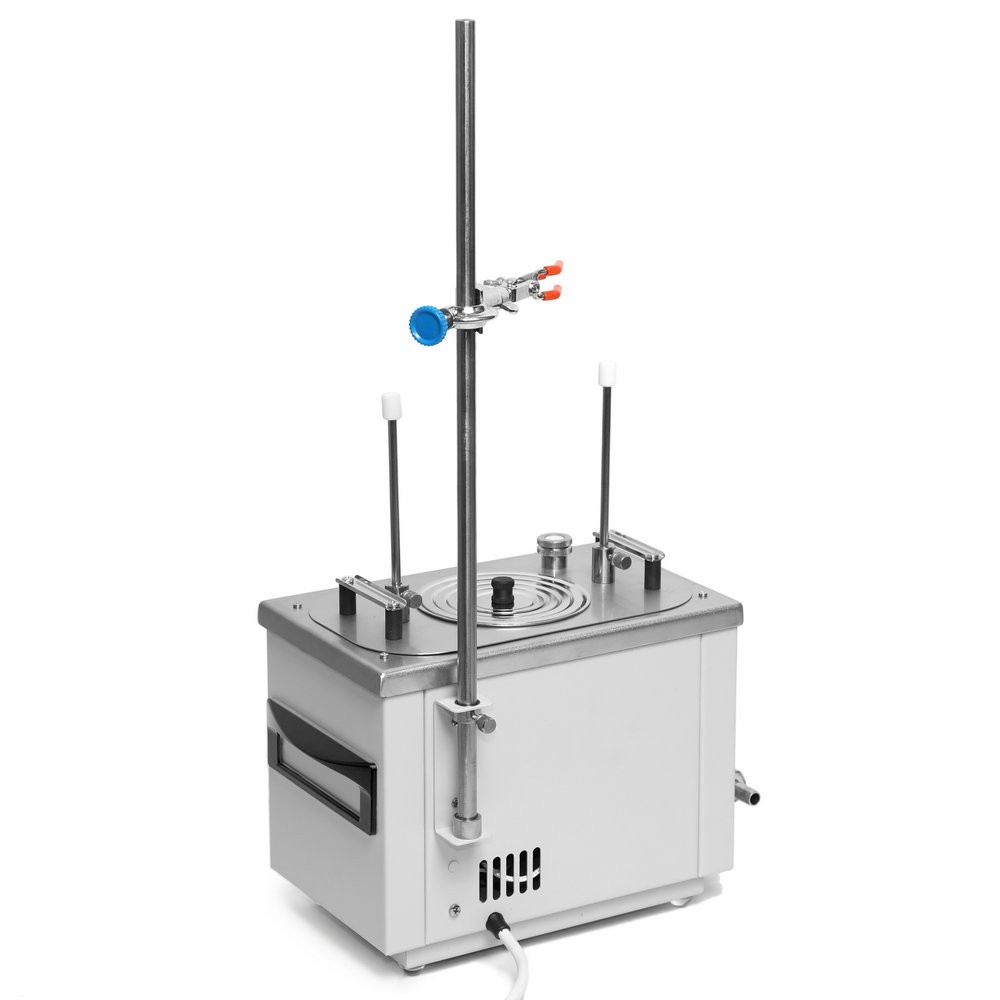 Универсальная баня ЛБ11‑Ш оснащена легко извлекаемой корзиной с подвижным дном для размещения лабораторной посуды различного размера, стальными концентрическими кольцами для ее уплотнения, штативом и лапкой с зажимом.