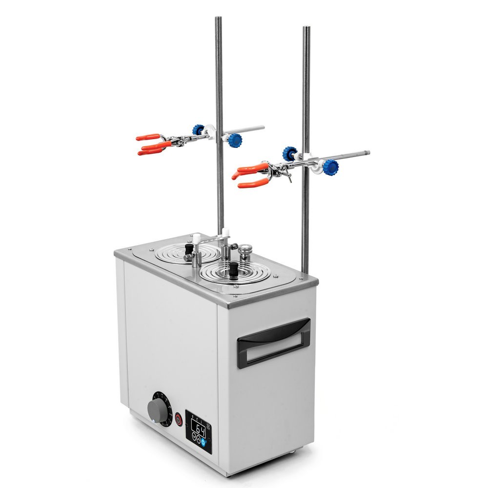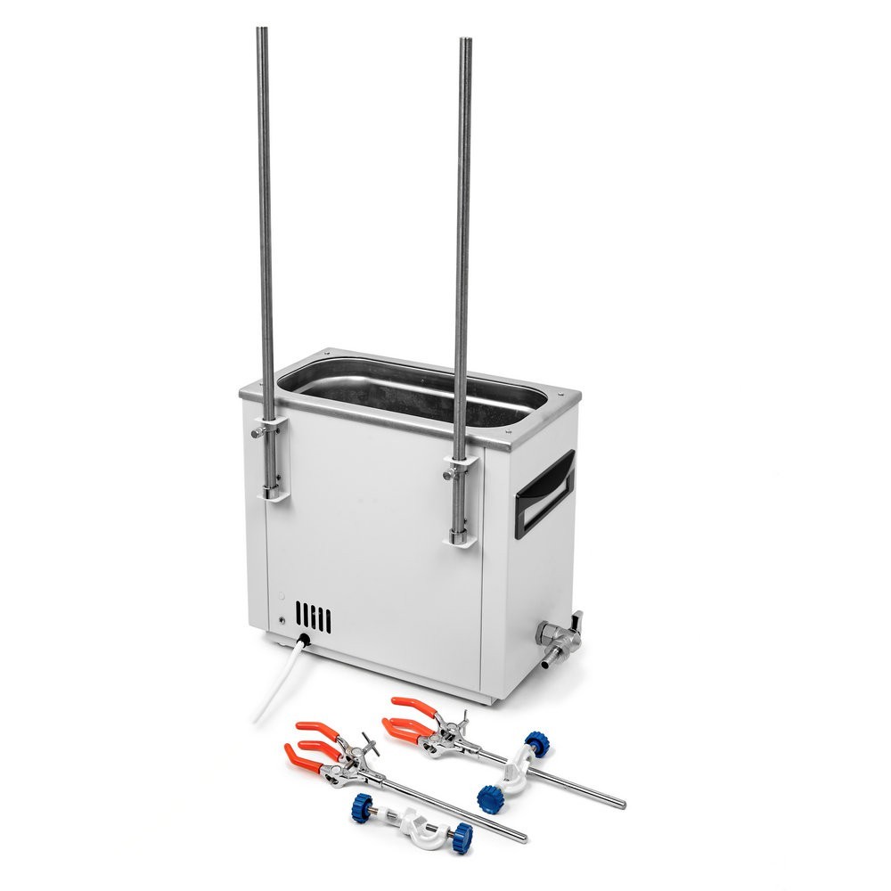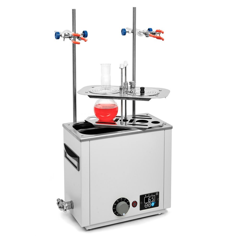 Универсальная баня ЛБ23‑Ш оснащена легко извлекаемой корзиной с подвижным дном для размещения лабораторной посуды различного размера, стальными концентрическими кольцами для ее уплотнения, штативами и лапками с зажимом.