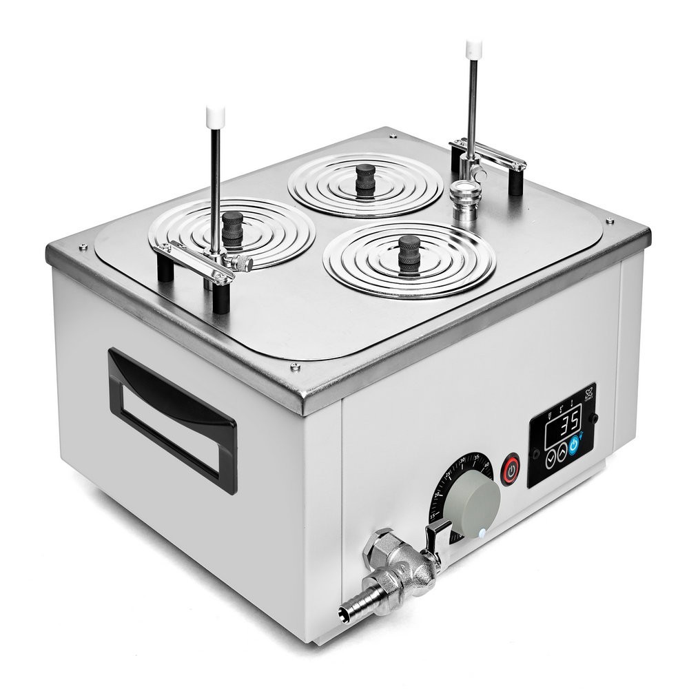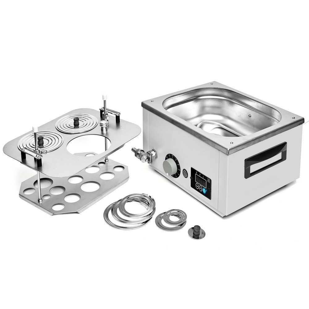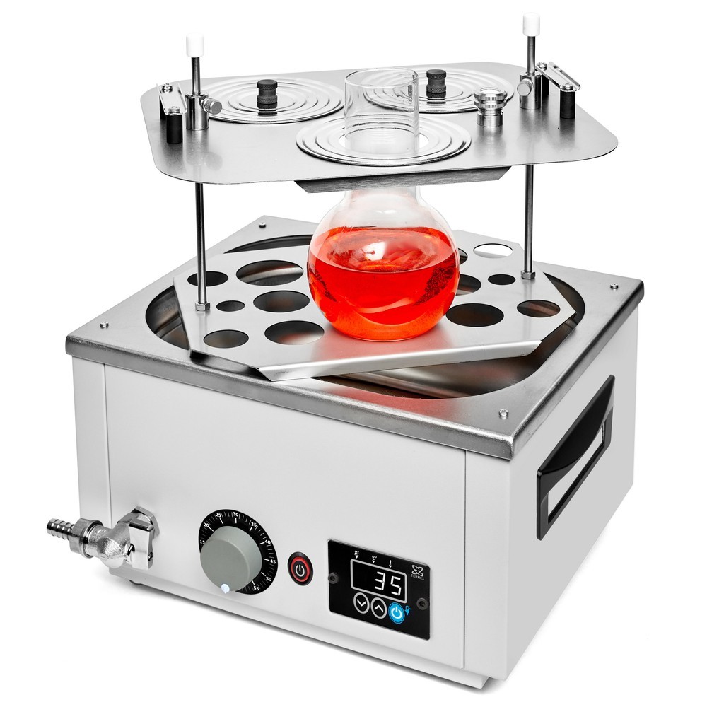 - Система из 5‑ти стальных концентрических колец позволяет уплотнять размещенные в ванне колбы, стаканы и другую лабораторную посуду.