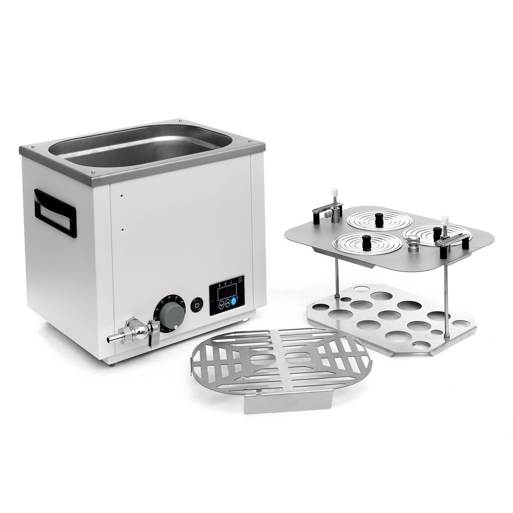 Универсальная баня ЛБ33 оснащена легко извлекаемой корзиной с подвижным дном для размещения лабораторной посуды различного размера и стальными концентрическими кольцами для ее уплотнения.