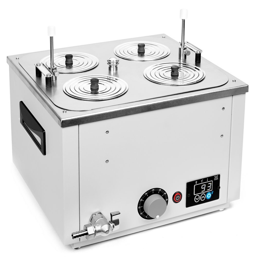 - Система из 5‑ти стальных концентрических колец позволяет уплотнять размещенные в ванне колбы, стаканы и другую лабораторную посуду.