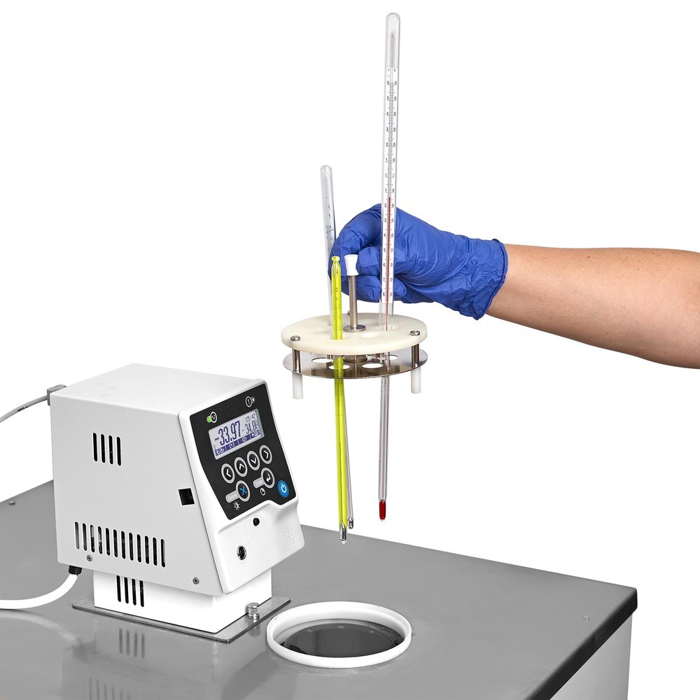 - Уровень теплоносителя в рабочей ванне позволяет снимать показания стеклянных термометров, погруженных до поверяемой отметки.