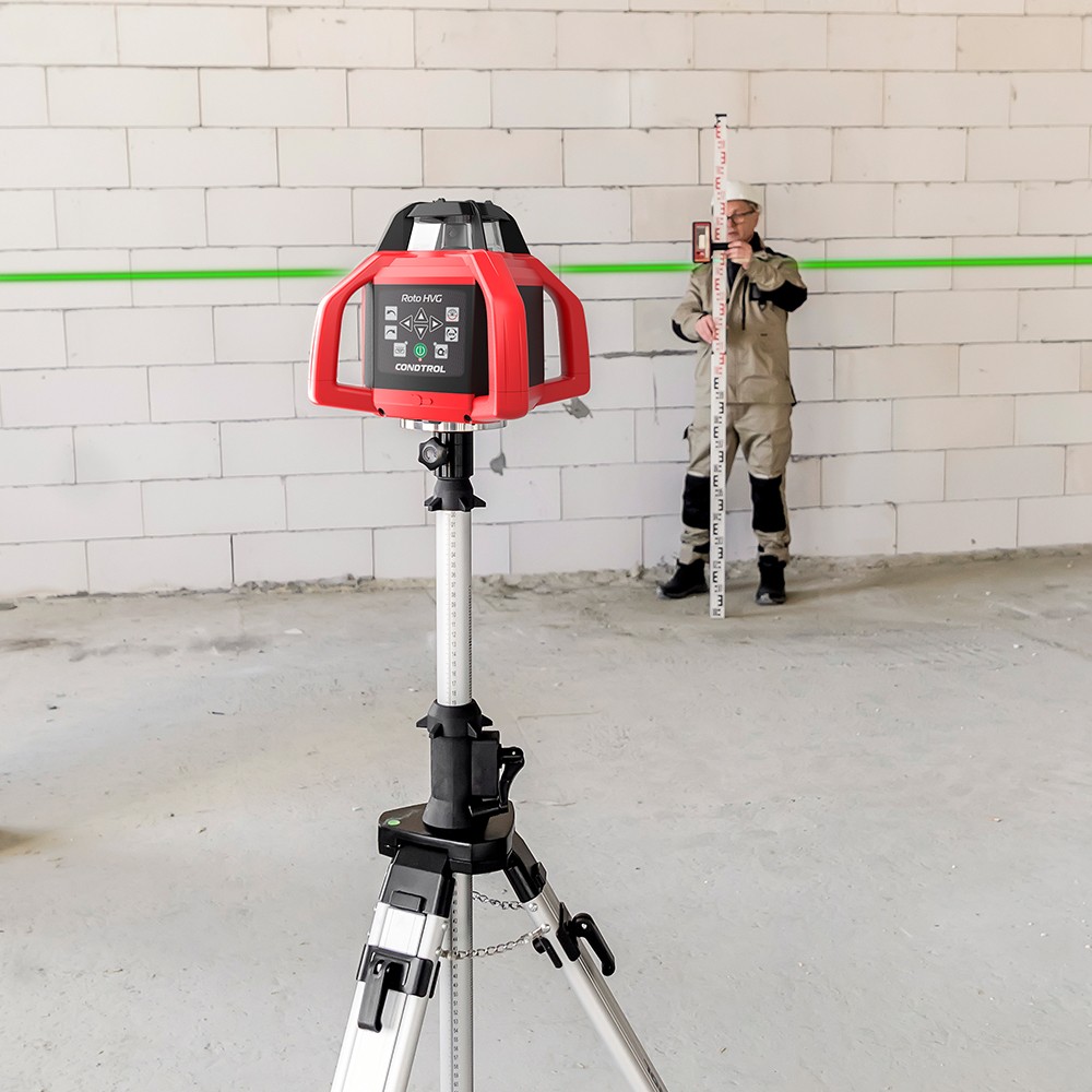 CONDTROL Roto HVG проецирует лучи зеленого цвета. Спектральная чувствительность человеческого зрения воспринимает этот цвет в 4 раза ярче красного при одинаковой мощности излучателя. Поэтому на больших расстояниях линия видна лучше, что увеличивает диапазон работы лазерного нивелира. В условиях неблагоприятной освещенности выручит имеющийся в комплекте приемник.