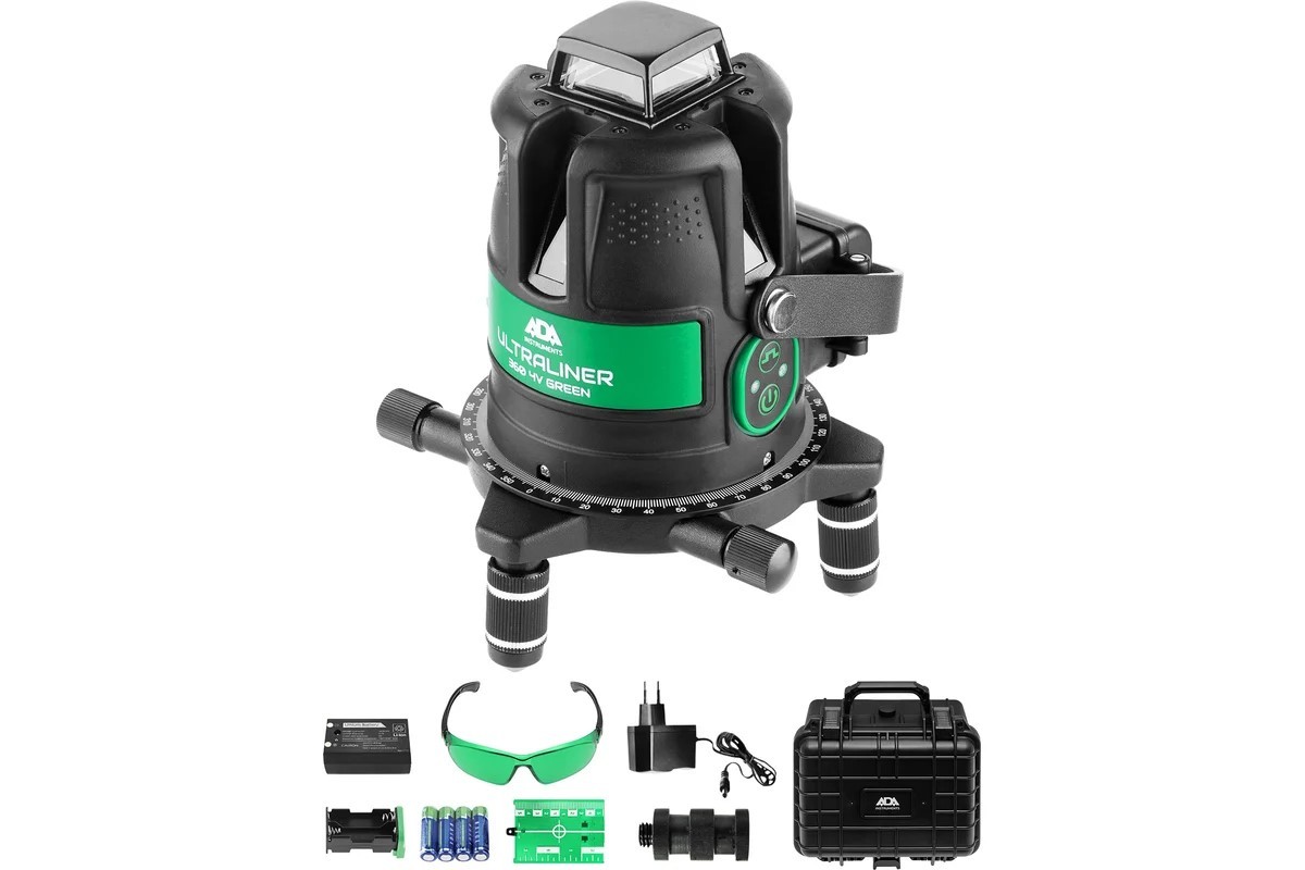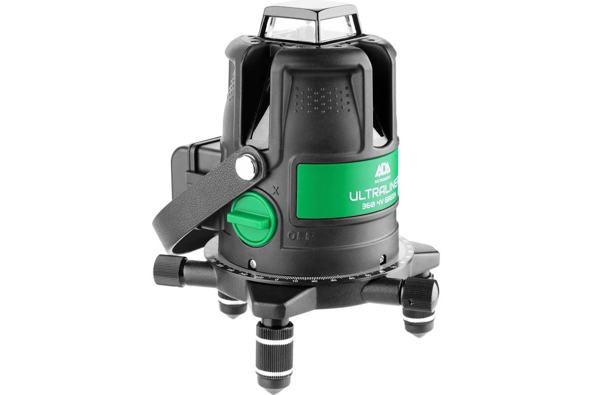Лазерный уровень ADA ULTRALiner 360 4V GREEN – профессиональный лазерный уровень для использования в строительстве и ремонте. ADA ULTRALiner 360 4V GREEN прибор с поворотным основанием и комбинированной разверткой лазерных лучей: круговая горизонтальная линия 360°, лазерный отвес (точка), плюс перпендикулярные вертикальные плоскости. Такая компоновка лазерных линий является оригинальной и наиболее полной. Благодаря этому прибор имеет максимальный функционал и подходит для всех видов разметочных работ.