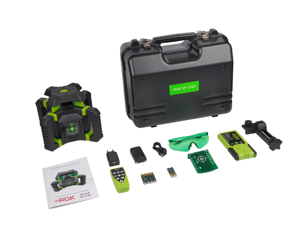 Оборудованный зеленым лазером, луч которого визуально воспринимается человеческим глазом ярче, по сравнению с красным, ротационный нивелир RGK SP-312G обеспечивает выполнение операций по выравниванию полов, монтажу навесных потолков, гипсокартонных перегородок и т.п. в помещениях с большой площадью, без перестановки проецирующего прибора. Наличие в комплекте поставки приемника лазерного излучения дает возможность производить измерения на открытых площадках до 600 м в диаметре. Пульт дистанционного управления позволяет менять режимы и производить необходимые регулировки, например, выставлять положение вертикальной опорной плоскости при монтаже фасадных систем, не приближаясь к инструменту, что исключает необходимость привлечения помощника.