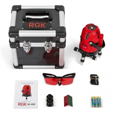 Корпус RGK UL-443 выполнен из качественных материалов и обеспечивает надёжную защиту прибора от строительной пыли и влажности. Питание прибора осуществляется от стандартных батареек типа АА. Прибор поставляется в ударопрочном кейсе.