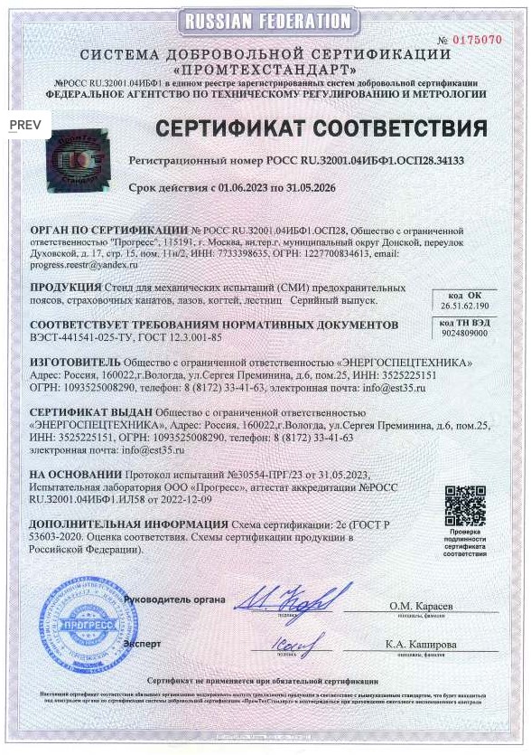 Стенд СМИ-1000 предназначен для проведения испытаний на механическую прочность средств индивидуальной защиты от падения с высоты (страховочные пояса любых типов, стропы, лестницы, стремянки, когти, лазы и т.п.). Максимальное создаваемое испытательное усилие до 5 кН