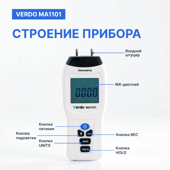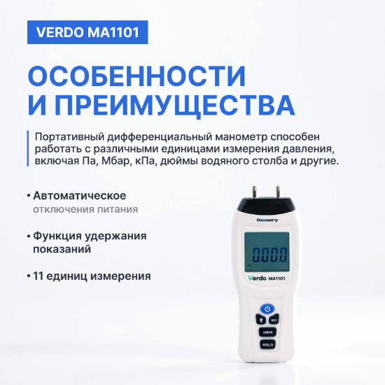 Verdo МА1101 представляет собой компактный и лёгкий дифференциальный манометр, предназначенный для точного измерения разницы давлений между двумя точками в воздушных и газовых системах.