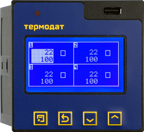 4 универсальных входа, 1 дискретный вход, 4 транзисторных выхода, 4 аналоговых выхода, интерфейс RS485, архивная память, USB-разъем |