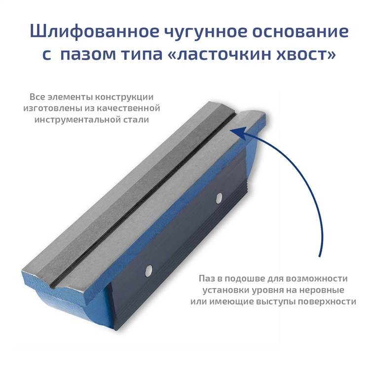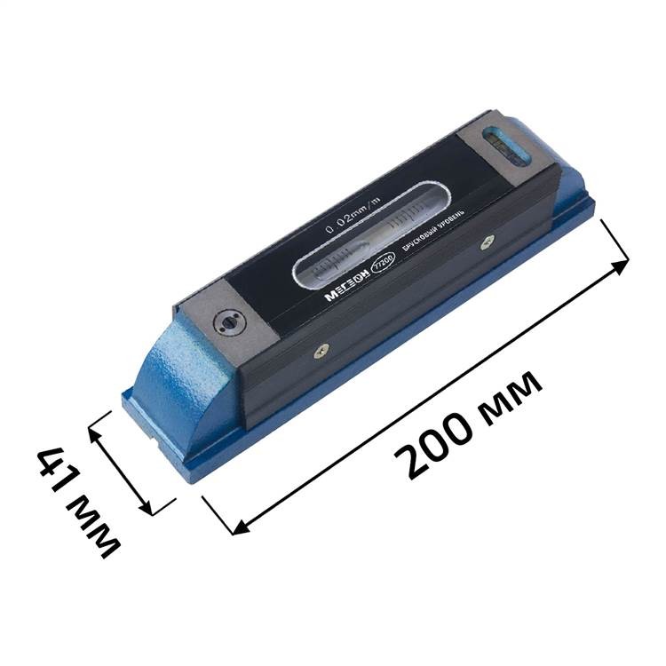 Основание уровня изготовлено из шлифованного чугуна, что придает ему дополнительную прочность и устойчивость к механическим воздействиям. Выборка на поверхности основания позволяет более точно контролировать положение уровня при работе. Точность уровня МЕГЕОН 77200 составляет 0,02 мм на метр, что делает его одним из самых точных уровней в своем классе.