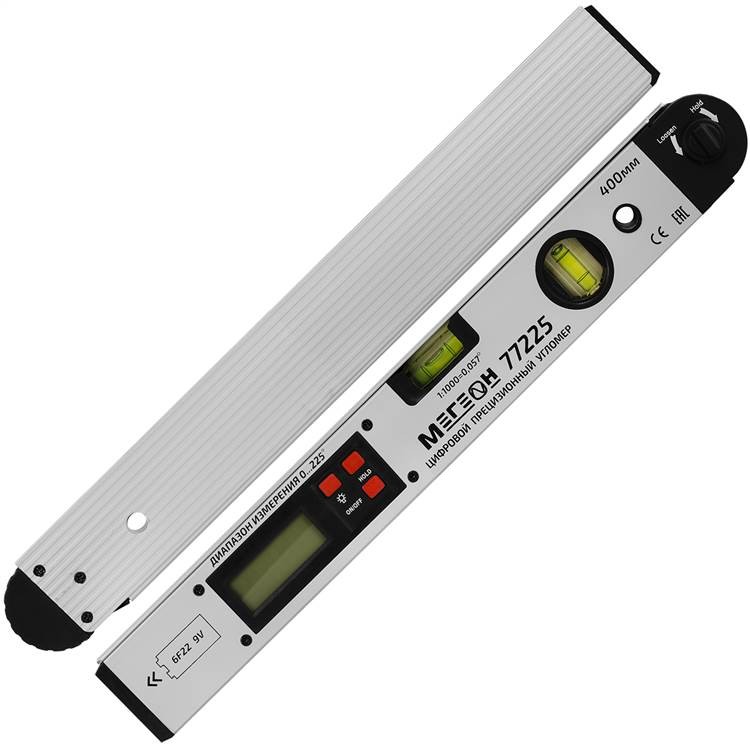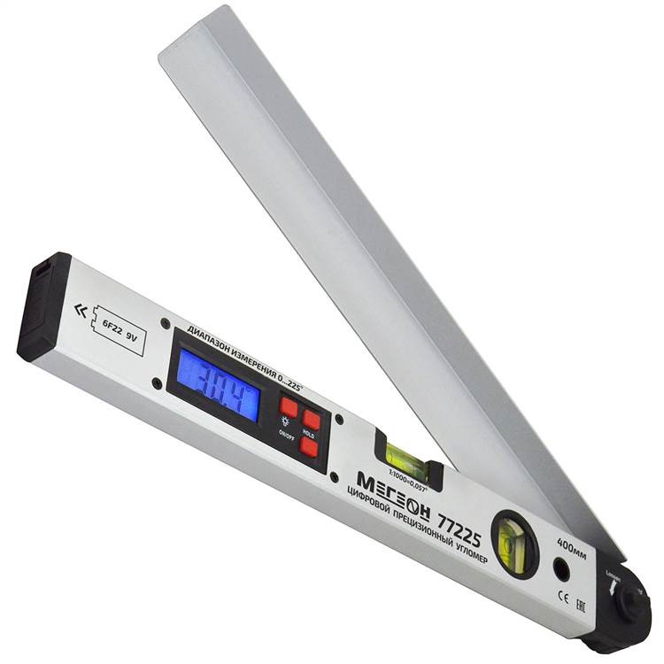 Модель МЕГЕОН 77225 оснащена большим дисплеем с подсветкой, что делает считывание показаний удобным даже в условиях недостаточной освещенности. Функция удержания данных позволяет зафиксировать текущее значение угла на дисплее для более удобного сравнения с предыдущими показаниями.