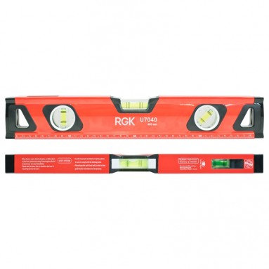 На узком верхнем ребре строительного уровня RGK U7040 находится окошко, в котором с помощью системы зеркал отображается положение пузырька вертикального уровня. Благодаря этому, удобно контролировать вертикальные поверхности в узких нишах и в прочих труднодоступных местах.