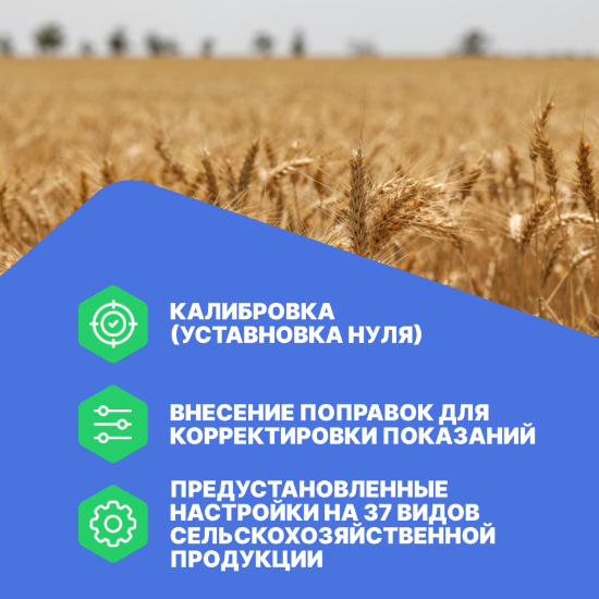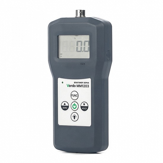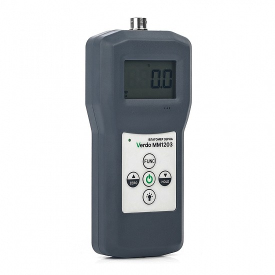 Влагомер зерновых культур VERDO MM1203 предназначен для измерения относительной влажности различных видов зерна (37 кодов) в процессе сбора, накопления, перевозки и хранения. В приборе реализован кондуктометрический метод измерения с автоматической температурной компенсацией. Также во влагомере предусмотрены функции калибровки (установки) нуля и корректировки показаний. Влагомер VERDO MM1203 имеет эргономичный корпус и оснащен большим ЖК-дисплеем с подсветкой для удобного считывания показаний, а также выносным щупом для удобства измерений. Питание влагомера осуществляется при помощи четырех батарей типа ААА.