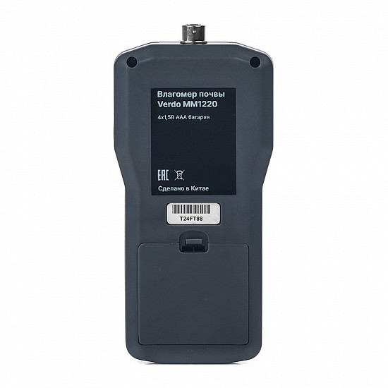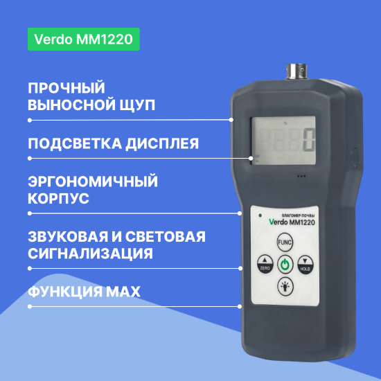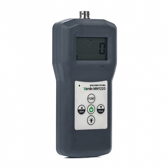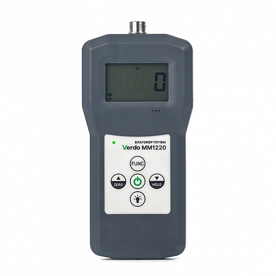 Влагомер почвы VERDO MM1220 предначен для измерения относительной влажности почвы, песка, цемента. Прибор может применяться в сельском хозяйстве, строительстве, промышленности, для научных исследований и в других отраслях. В этой модели реализован кондуктометрический метод измерения с автоматической температурной компенсацией. Также во влагомере предусмотрены функции калибровки (установки) нуля и корректировки показаний. Влагомер VERDO MM1220 имеет эргономичный корпус и оснащен большим ЖК-дисплеем с посдветкой для удобного считывания показаний, а также выносным щупом для удобства измерений. Питание влагомера осуществляется при помощи четырех батарей типа ААА.