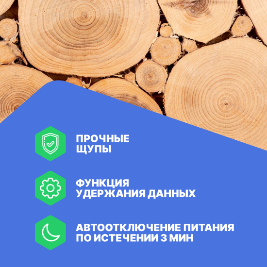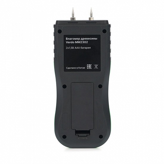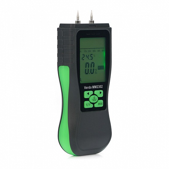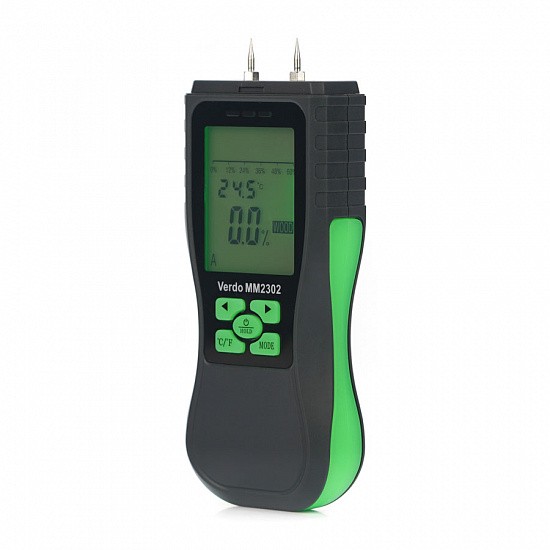 Влагомер древесины VERDO MM2302 предназначен для измерения относительной влажности древесины (8 шкал) и строительных материалов. В приборе реализован кондуктометрический метод измерения. Влагомер VERDO MM2302 имеет эргономичный корпус и оснащен большим ЖК-дисплеем с подсветкой для удобного считывания показаний. Прибор дополнительно оснащен функцией измерения температуры окружающей среды. Питание влагомера осуществляется при помощи 2 шт. батарей типа ААА.