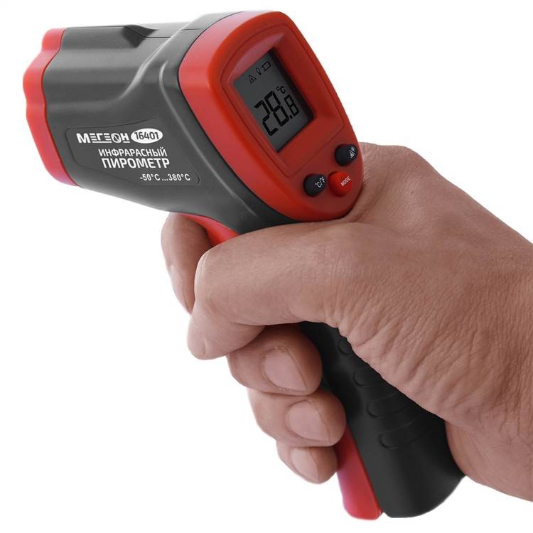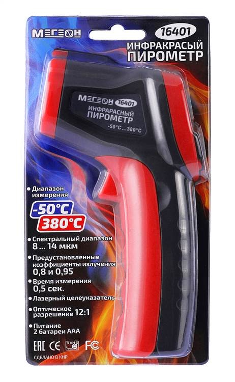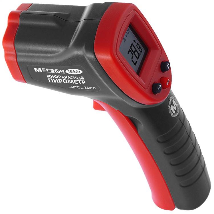 МЕГЕОН 16401 - промышленный высокоточный бесконтактный термометр. Технические возможности прибора позволяют проводить измерения в диапазоне -50 ... 380°С. Программное обеспечение даёт возможность осуществить установку коэффициента излучения в зависимости от отражающей способности исследуемого предмета. Время проведения замеров сведено к минимуму до 0,5 секунды. Все полученные результаты отображаются на ЖК-дисплее с яркой светодиодной подсветкой. Для изготовления корпуса был выбран качественный пластик повышенной прочности. С целью удобства проведения измерений пирометр оснащён лазерным целеуказателем. Увеличение срока службы элементов питания осуществляется функцией автоматического отключения измерителя после 15 сек. бездействия. Эргономичный вид, качество изготовления и параметры изделия удовлетворят требования самых искушённых пользователей
