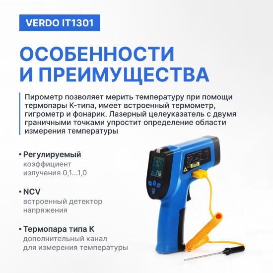 Пирометр инфракрасный Verdo IT1301 предназначен для бесконтактного измерения температуры различных объектов. Пирометр может применяться в машиностроении, химической керамической, легкой, пищевой, металлургической, электроэнергетической и других отраслях промышленности.