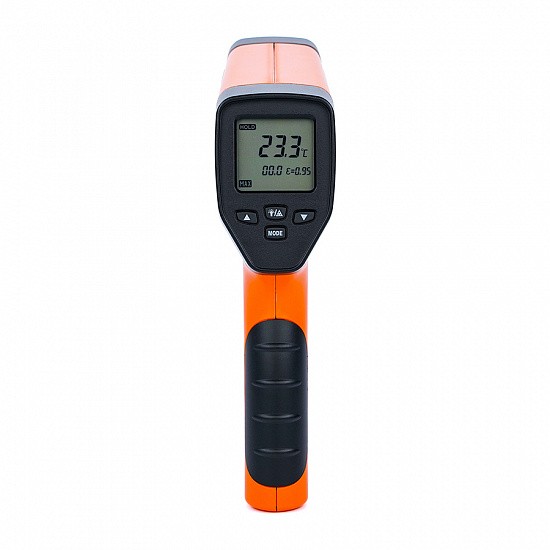 Пирометр Verdo оснащён жидкокристаллическим дисплеем с подсветкой для удобного считывания показаний и имеет различные функции, такие как измерение пиковой, средней и минимальной температуры, выбор излучательной способности материала и указание расстояния до объекта измерения.