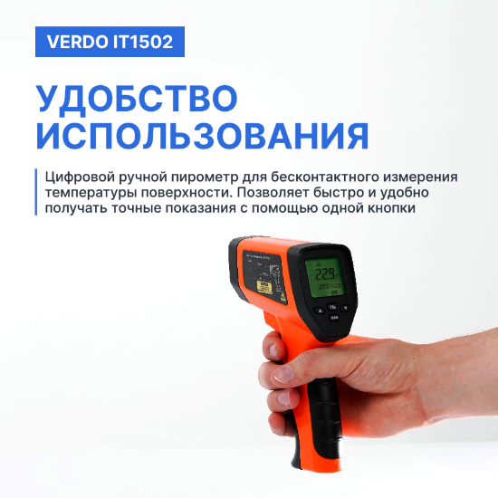 Инфракрасный пирометр Verdo IT1502 — это высокотехнологичный прибор для бесконтактного измерения температуры поверхностей. Он работает на основе измерения инфракрасного излучения объекта и преобразования его в электрический сигнал, пропорциональный температуре.