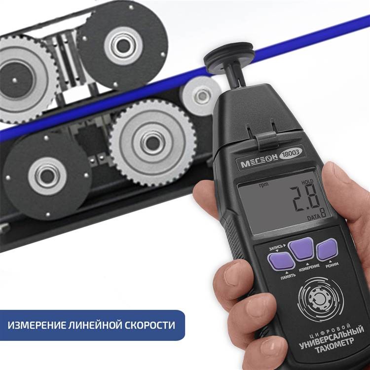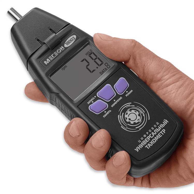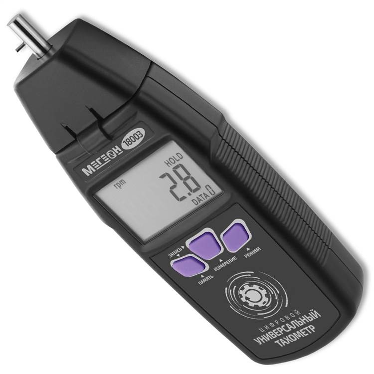 Портативный цифровой тахометр МЕГЕОН 18003 нашел широкое применение при проведении измерений скорости вращения различных объектов. Имеет комбинированную конструкцию, которая позволяет выполнять измерения контактным и бесконтактным методами. Помимо измерений вращения позволяет получить результаты перемещения или длины. Представленная модель является высокоточным измерительным инструментом, который способен измерять скорость вращения в диапазоне оборотов от 30 до 99996 об/мин (лазерный метод измерения) и от 4 до 20000 об/мин (контактный режим), а также линейное перемещение предметов в диапазоне 0,1 ... 800 м/мин. Вся информация выводится на большой ЖК-дисплей. Прибор оснащен функцией определять минимальные, средние и максимальные показатели измерений, которые автоматически сохраняются в память ёмкостью 30 ячеек (по 10 на каждый тип показателей) и дополнительно имеются 10 ячеек для сохранения полученных пользователем значений измерений. Найдёт широкое применение среди специалистов, чья профессиональная деятельность так или иначе связана с измерением скорости вращения различных объектов и предметов.