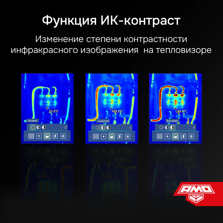 Прибор поддерживает различные палитры отображения: "Железо", "Радуга", "Холод-тепло" и другие, что позволяет визуально выделять зоны с аномальной температурой. Пользователь может настроить контрастность инфракрасного изображения (функция ИК-контраст), чтобы лучше различать нюансы. Режимы отображения можно переключать в реальном времени, что удобно при сравнении различных участков объекта.