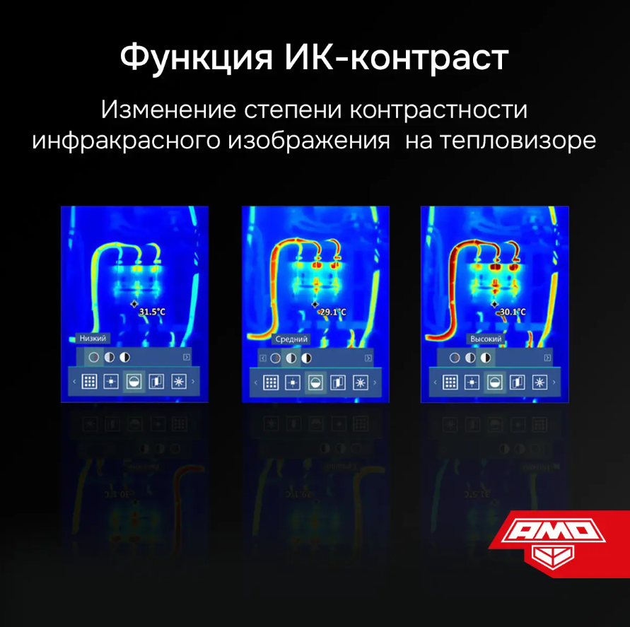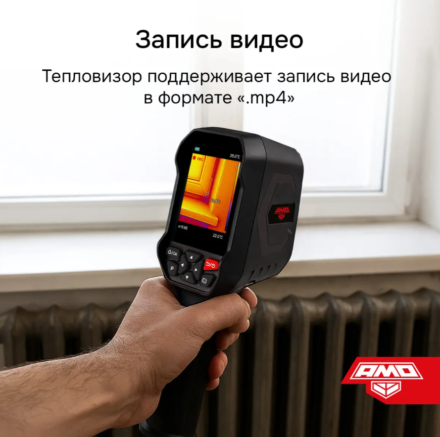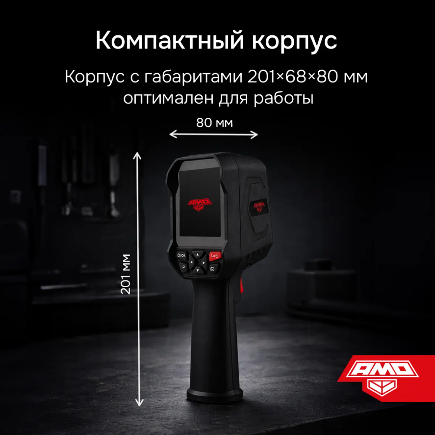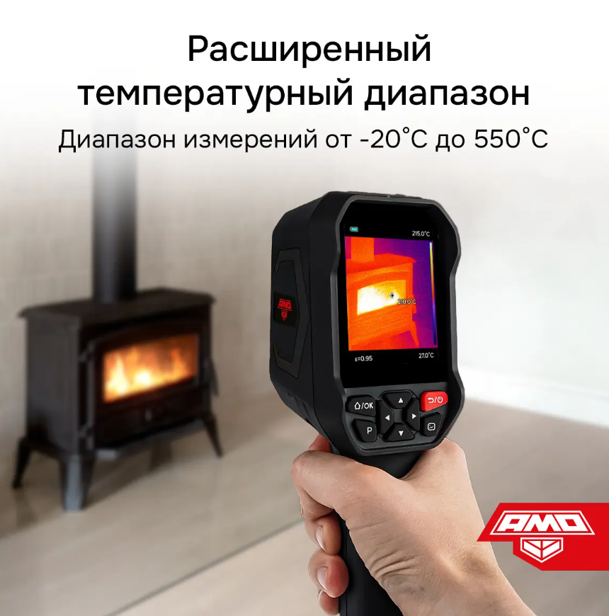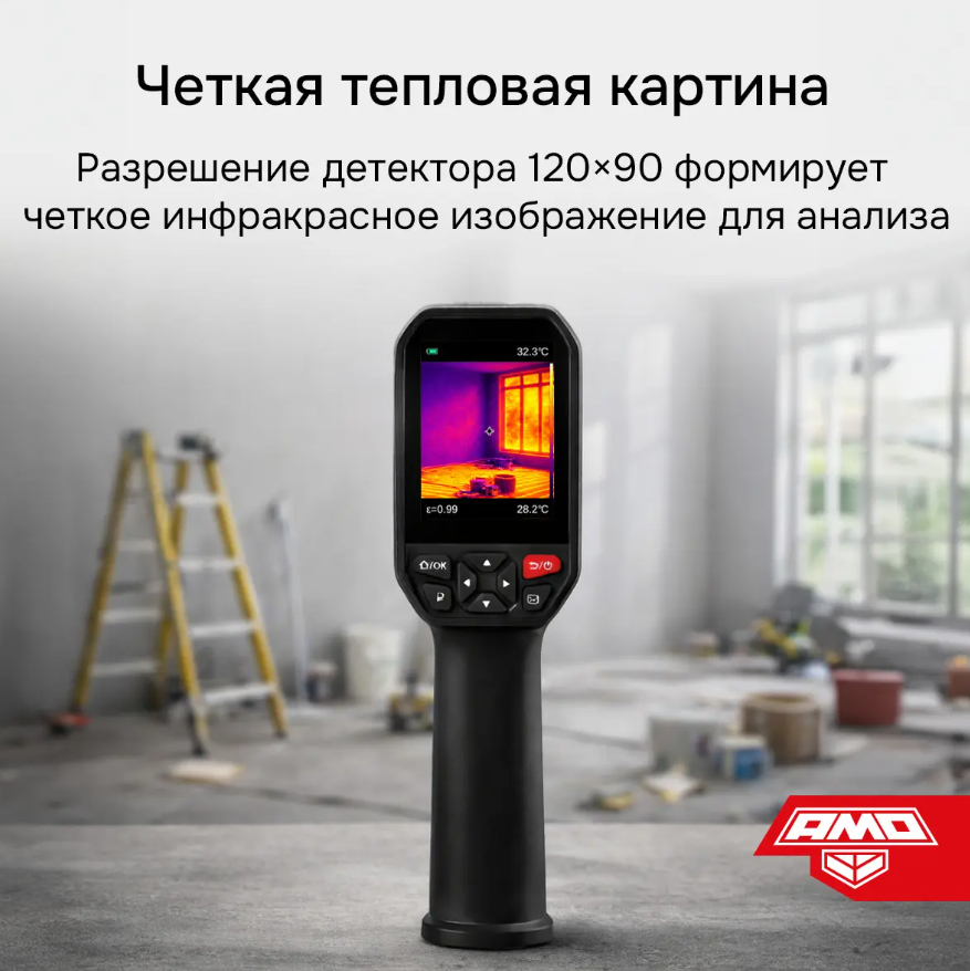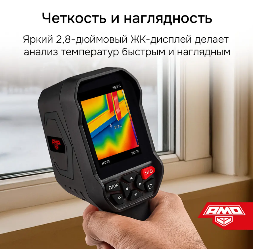 Тепловизор AMO T815 представляет собой компактный прибор, выполненный в пистолетном форм-факторе и снабженный аккумуляторным питанием, который реализует базовые функции анализа и документирования. Он способен выполнять визуализацию тепловых полей в разных палитрах и дистанционно определять поверхностную температуру целевых объектов в пределах от –20 до +550°С, благодаря чему подходит для использования в строительной отрасли – для выявления тепловых утечек, а также может применяться для диагностики электросилового и механического оборудования.