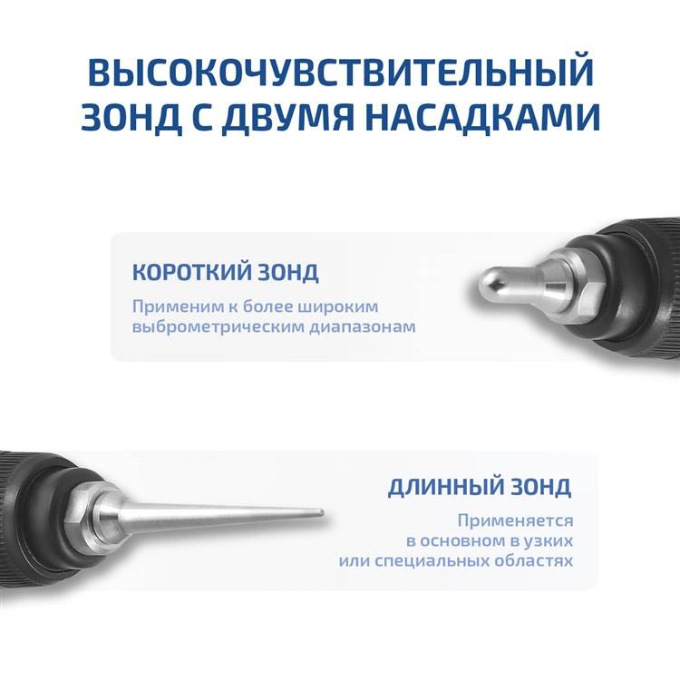 Комплект поставки виброметра включает в себя два разных типа щупов, которые подходят для измерения различных типов вибрации. Это делает устройство универсальным и позволяет использовать его в различных условиях и для различных целей.