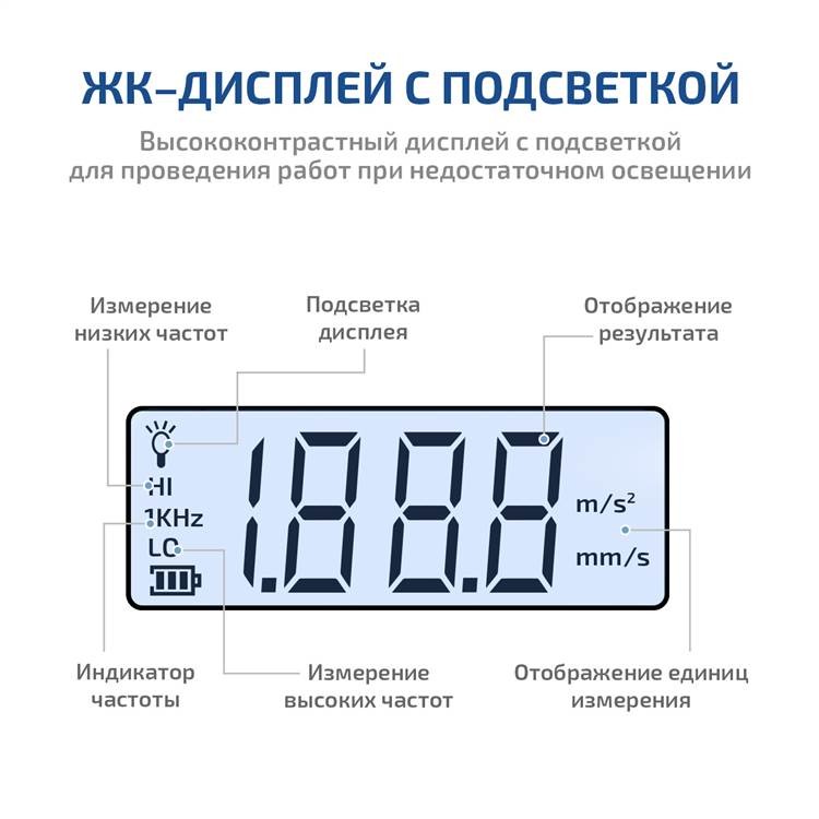 Помимо высокой чувствительности, виброметр отличается ярким дисплеем с подсветкой, что делает использование устройства удобным даже в условиях плохой видимости или недостаточной освещенности.