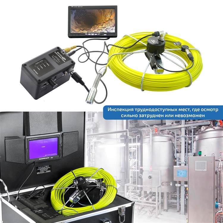 Жесткий зонд видеоскопа имеет длину 50 метров, что позволяет проводить исследования на значительных расстояниях от объекта. Камера прибора имеет защиту IP67, которая обеспечивает устойчивость к воздействию влаги и пыли, что повышает надежность и срок службы устройства.