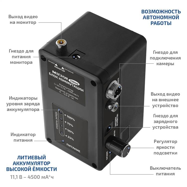 Устройство оснащено удобным кейсом для транспортировки и хранения, который обеспечивает безопасность и сохранность прибора при его переноске. Благодаря наличию литиевого аккумулятора повышенной емкости, видеоскоп может работать автономно, без необходимости подключения к источнику питания.