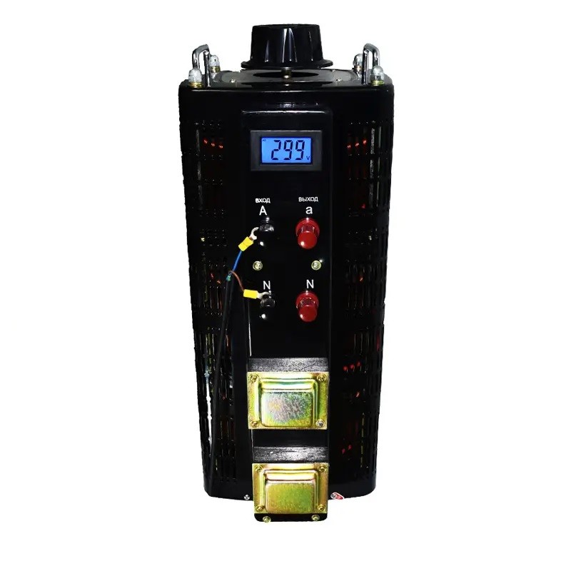 ЛАТР (лабораторный автотрансформатор) производства SUNTEK отличается отображением показаний выходного напряжения на Жидкокристаллическом (ЖК) табло (информативно и точно), плавным ходом ручки-регулятора, удобным креплением входных и выходных проводов, качеством сборки. ЛАТР SUNTEK позволяет изменять выходное напряжение от 0 Вольт до 300 Вольт с точностью до 1 Вольта.