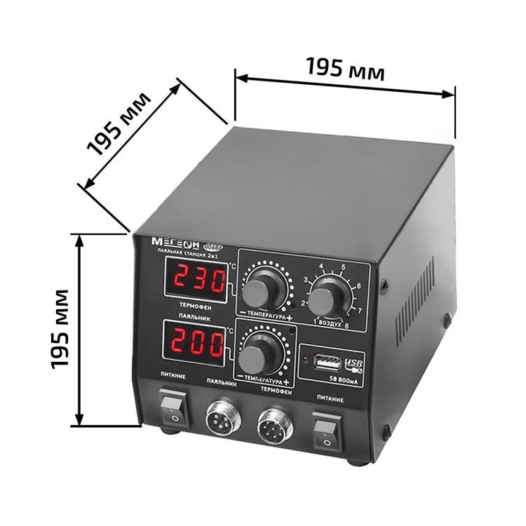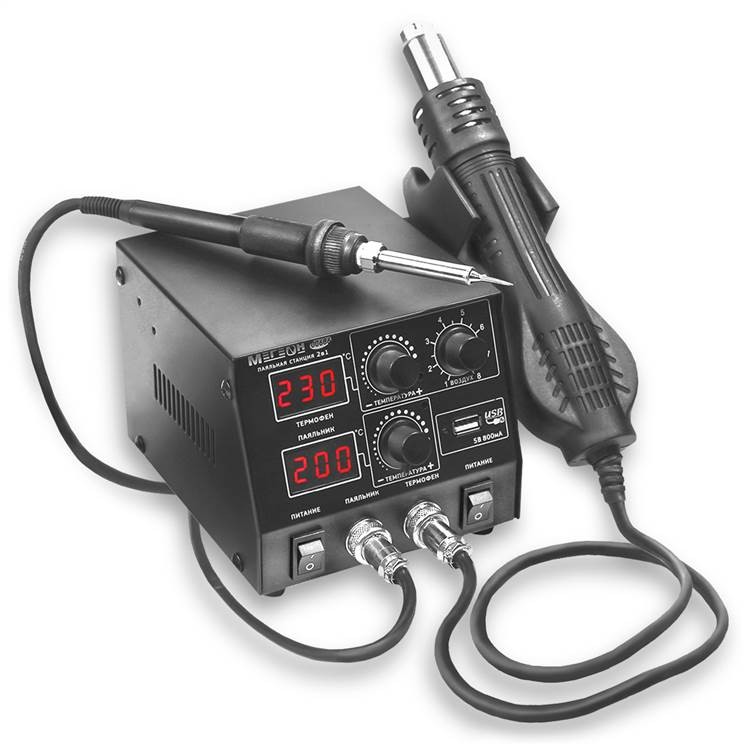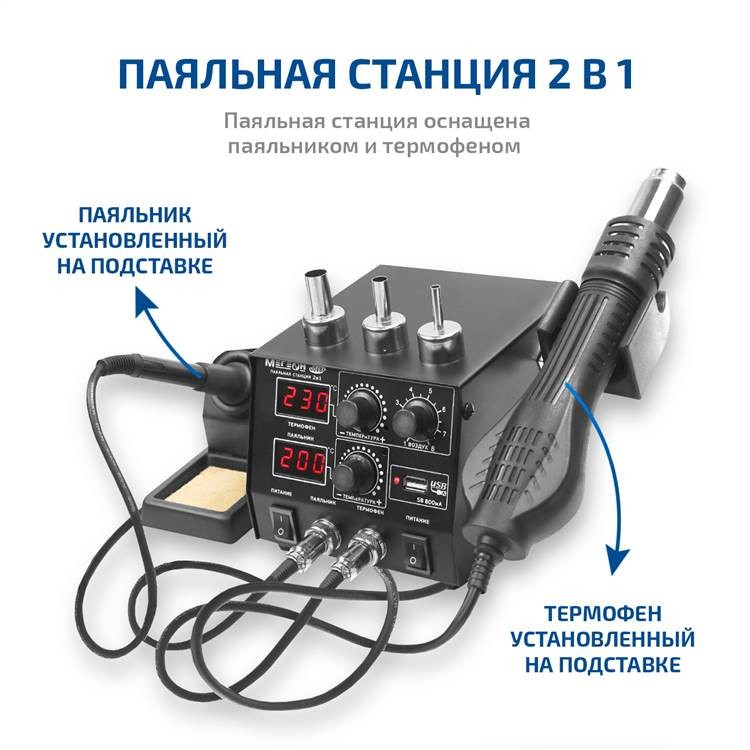 USB-порт позволяет заряжать различные устройства, что добавляет удобства в использовании. Удобные энкодеры позволяют точно установить температуру термофена и паяльника. Аналоговый регулятор потока воздуха помогает контролировать интенсивность воздушного потока, что особенно полезно при работе с различными материалами.