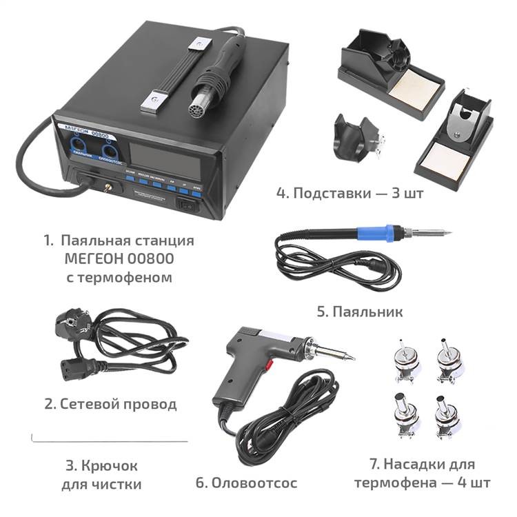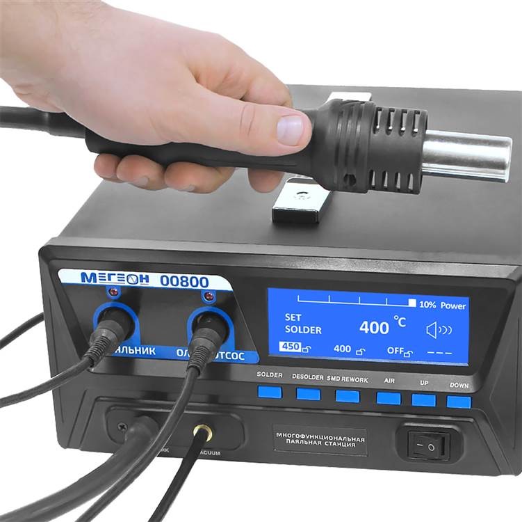 Многофункциональная паяльная станция Мегеон 00800 - это идеальное решение для профессиональных ремонтников и любителей электроники, которые ценят удобство, точность и эффективность. Она обладает двумя основными рабочими инструментами - термофеном и паяльником, каждый из которых обеспечивает мощность, достаточную для выполнения широкого спектра задач.