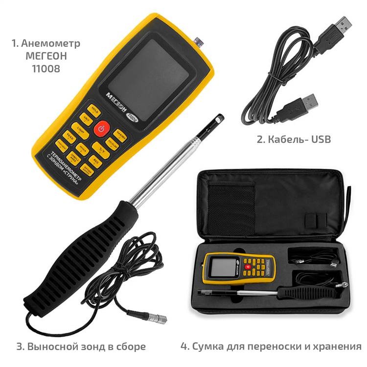 Стандартный комплект поставки анемометра включает в себя все необходимое программное обеспечение и USB-кабель для подключения к компьютеру. Это позволяет пользователям легко обрабатывать и анализировать полученные данные, а также создавать отчеты о проведенных исследованиях.