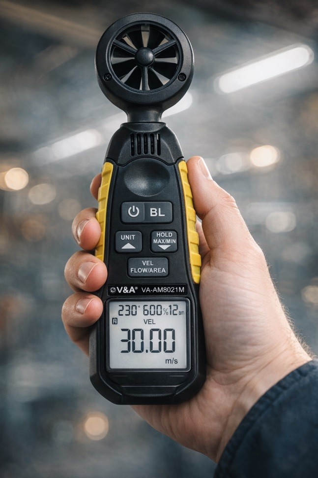 Анемометр крыльчатый VA-АМ8021М — профессиональный прибор нового поколения для точного измерения скорости воздушного потока, температуры, влажности и расхода воздуха.