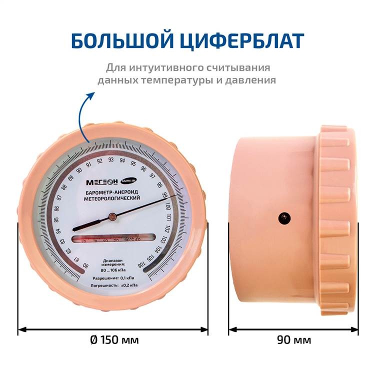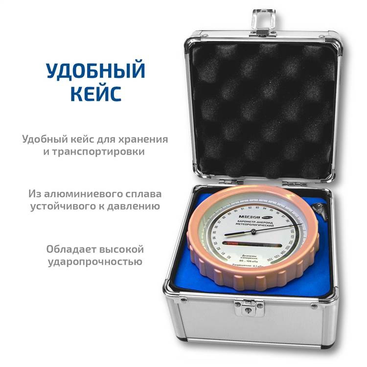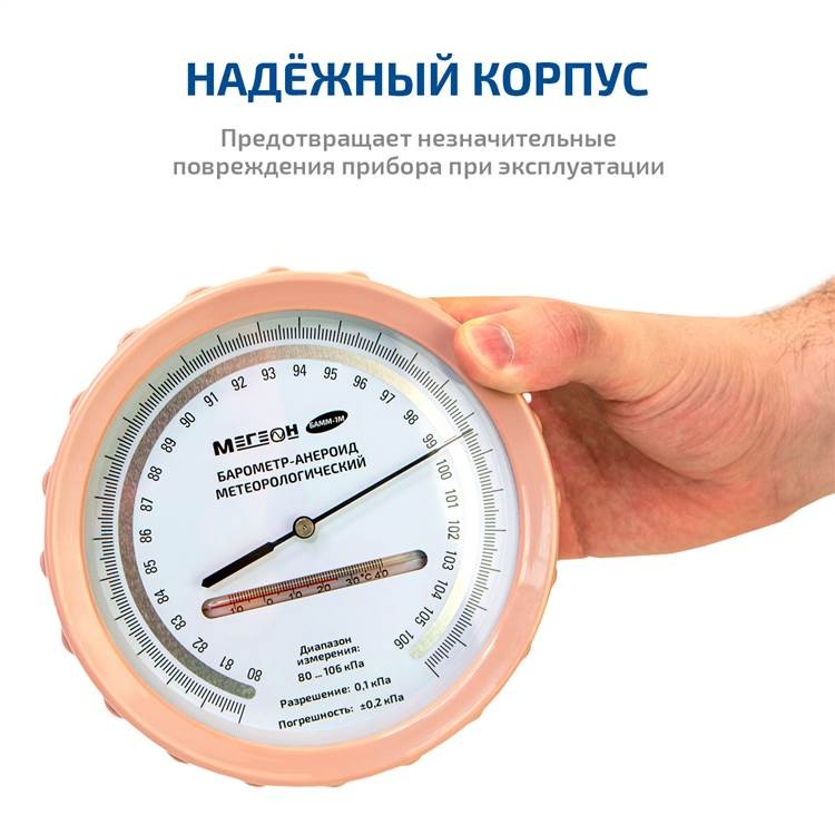 МЕГЕОН БАММ-1М – это реестровый метеорологический барометр-анероид, предназначенный для измерения атмосферного давления. Может применяться в промышленных, научных и учебных целях. Модель получила классическое исполнение, компактные размеры корпуса из прозрачного и одновременно прочного пластика, а также маленький вес. Рабочие органы анероидного механизма изготовлены с применением только проверенных материалов и комплектующих в соответствии с требованием стандартов качества к подобной продукции, благодаря чему, удалось достичь низких показателей погрешности. В дополнение, на детали сделанные из сталей чёрных металлов, было нанесено антикоррозийное цинковое покрытие с последующим радужным хроматированием. Защита такого типа позволяет продлить срок службы, а также сохранить красивый внешний вид на долгое время. Не требует настроек и готов к эксплуатации. Прибор по достоинству оценят профессионалы и любители.