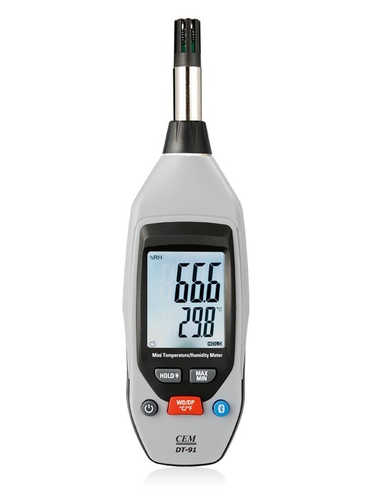 DT-91 Цифровой термогигрометр измеряет температуру в диапазоне −20...60°С ±2°С, влажность 0...100%RH ±5%RH, точку росы. У прибора ЖК-дисплей с двумя цифровыми индикаторами и подсветкой, функция MAX/MIN, Bluetooth 4.0.